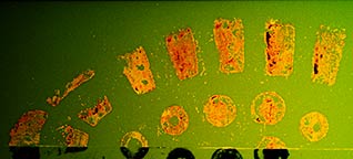 The gelatin layer of the white Gellifter absorbs blood and dyes from staining solutions. These traces can easily be copied onto the gelatin layer and then viewed free from a interfering background. The extreme white color of this Gellifter has a low fluorescence. Staining solutions which fluoresce when excited with green light (e.g., Hungarian Red) will therefore show up in high contrast to the gelatin layer. We advise that shoeprints in dust be lifted with the black Gellifters, even when lifting darkcolored prints that intuitively would seem to contrast better on white Gellifters. A clearer and better contrasting result is always obtained with a black Gellifter.