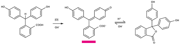 Left: phenolphthalin. Middle: after oxidation and removing of a proton by a base the pink phenolphthalein is formed. Right: in an acidic environment a colorless form of phenolphthalein is formed.